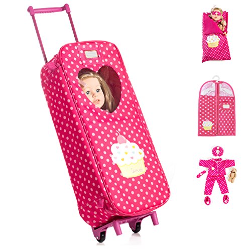 8 Piece Doll Traveling Trolley Set, Trolley, Pajamas, Travel pillow, Mini Teddy bear, Eye cover, Slippers, Sleeping bag with pillow, Garment bag. Doll not inluded!