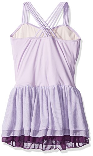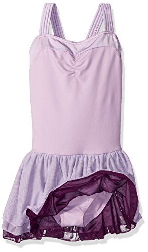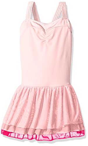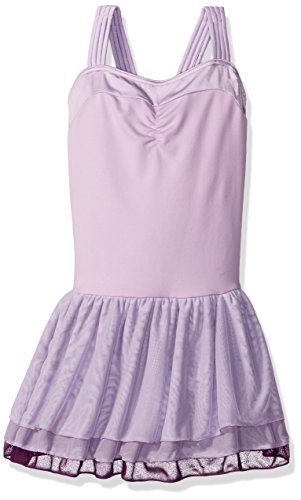 This beautiful ballet dress features an intricate configuration of interweaving back straps. Four straps on each side criss and cross to create a gorgeous basket weave pattern across her shoulders. The triple layer skirt has a slightly darker underlay giving it a fashionable ombre effect. The sweetheart neckline is just the icing on the cake. She will look like a princess in this perfect ballet dress.Feature