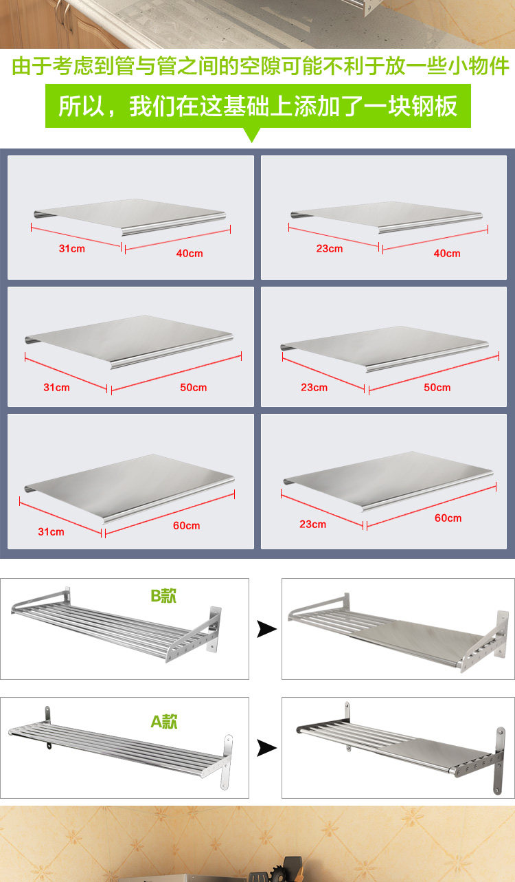 二,A款27CM *6根配优质不锈钢杆 B款35CM *7根304不锈刚杆 所有配置的是加厚直径16MM的不锈钢管. 承重30KG以上