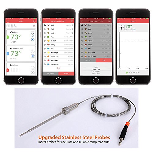 6 PROBE SIMULTANEOUS MONITORING: Comes shipped with 2 probes but add up to 4 more! Remote monitor food temperatures in either Celsius or Fahrenheit and get multi alerts. adjust and save pro cooking presets for your favorite kitchen recipes