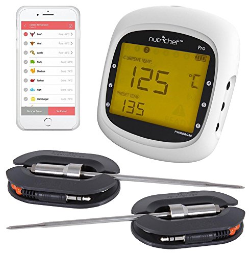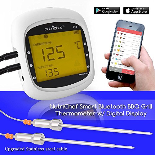 NutriChef Smart Bluetooth BBQ Grill Thermometer w/ Digital Display - Stainless Dual Probes Safe to Leave in Outdoor Barbecue Meat Smoker - Wireless Remote Alert iOS Android Phone WiFi App - PWIRBBQ80