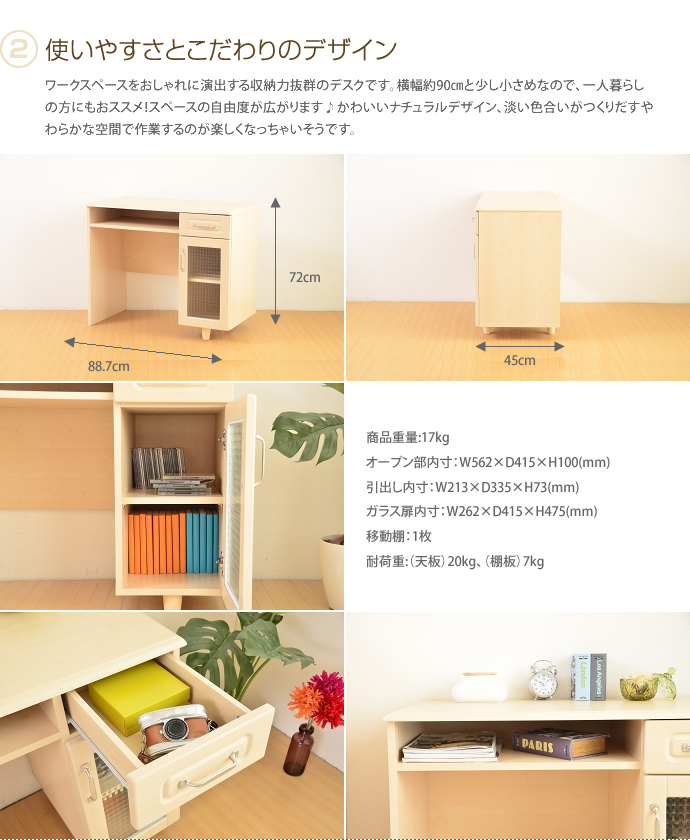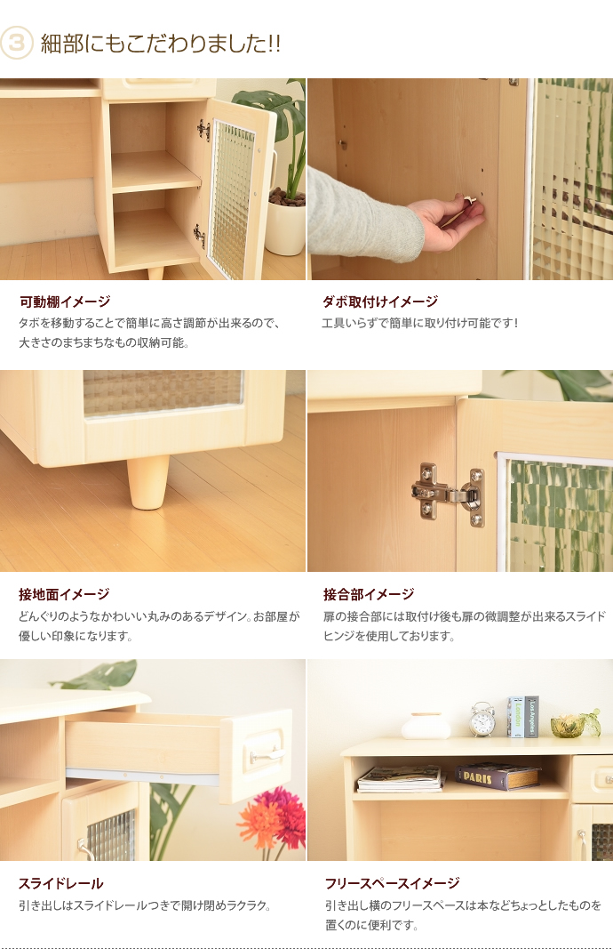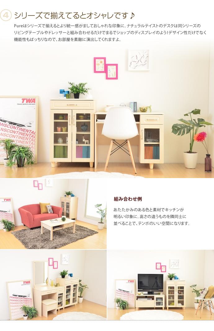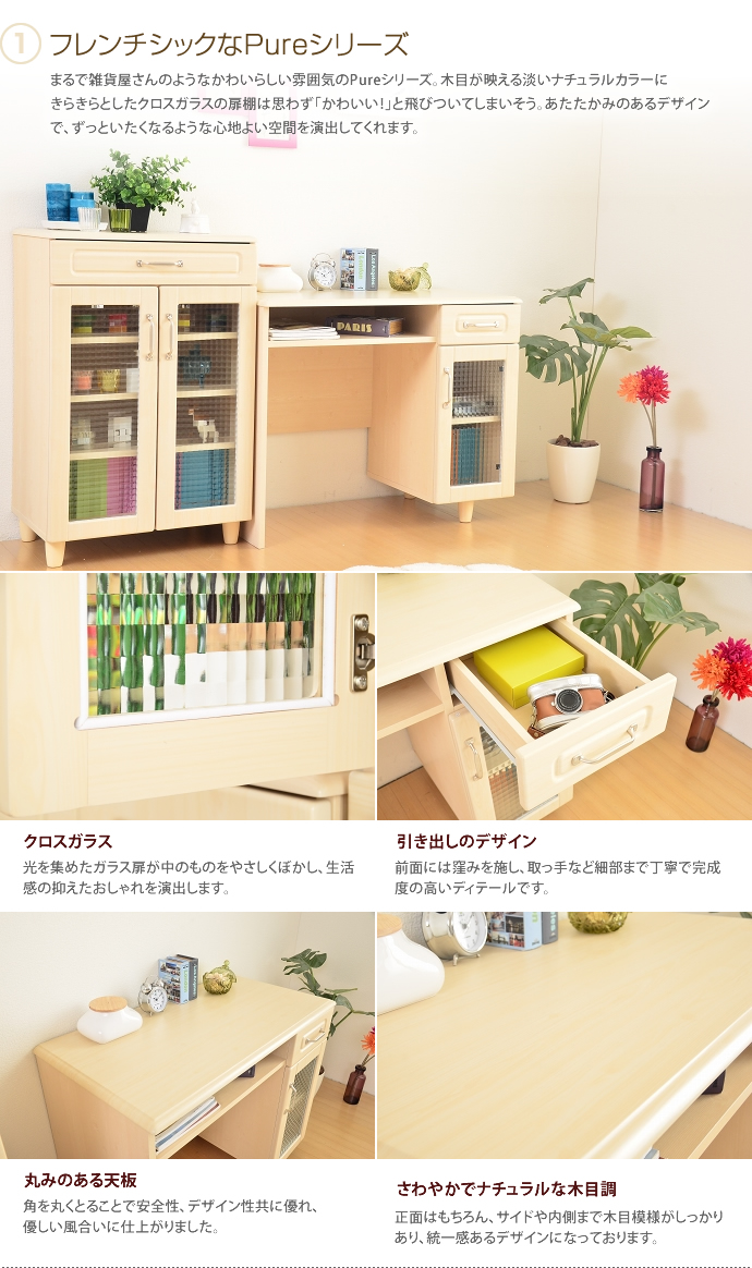木目調のカラーにクロスガラスの組合せが可愛らしい「Pure」シリーズ。収納扉取付け後でも扉の微調整が出来るスライドヒンジ使用。棚は可動式なので高さの調節が可能です。小さめのサイズながら収納力に優れたハイデスクです。