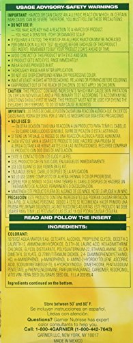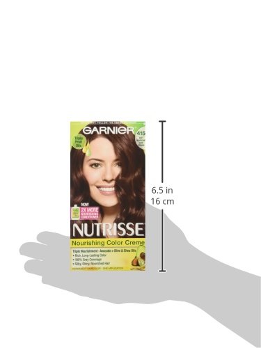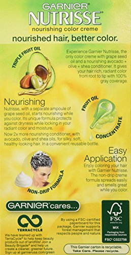 Nourished hair means better color nourishing. Experience garnier nutrisse, the nourishing color treatment that gives you rich, healthy-looking color. This exclusive color treatment, enriched with conditioners and fruit oil concentrate, penetrates deep into hair fibers to deliver rich, long-lasting color that covers gray completely. Natural. Enjoy the unique avocado enriched conditioner that harnesses the restorative properties of avocado oil with vitamin e. It protects against dryness while locking color and moisture to keep your color radiant and your hair silky soft. Easy application. Love coloring your hair with the nourishing creme formula enhanced with fragrant grape seed oil you only get from garnier nutrisse. The non-drip formula spreads easily and smells great while you color. Enriched with fruit oil concentrates: avocado oil with vitamin e and fragrant grape seed oil. Scientifically developed with natural ingredients to help you look healthy and feel better every day. Find your hair color result on the side of box.Feature