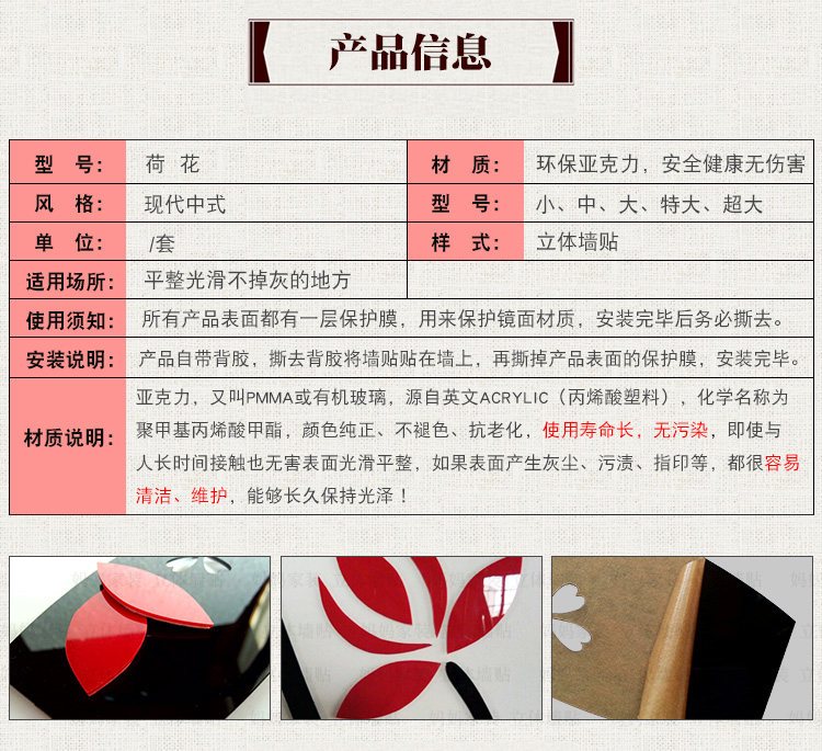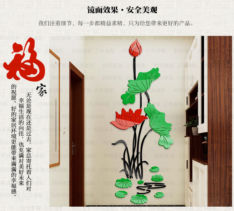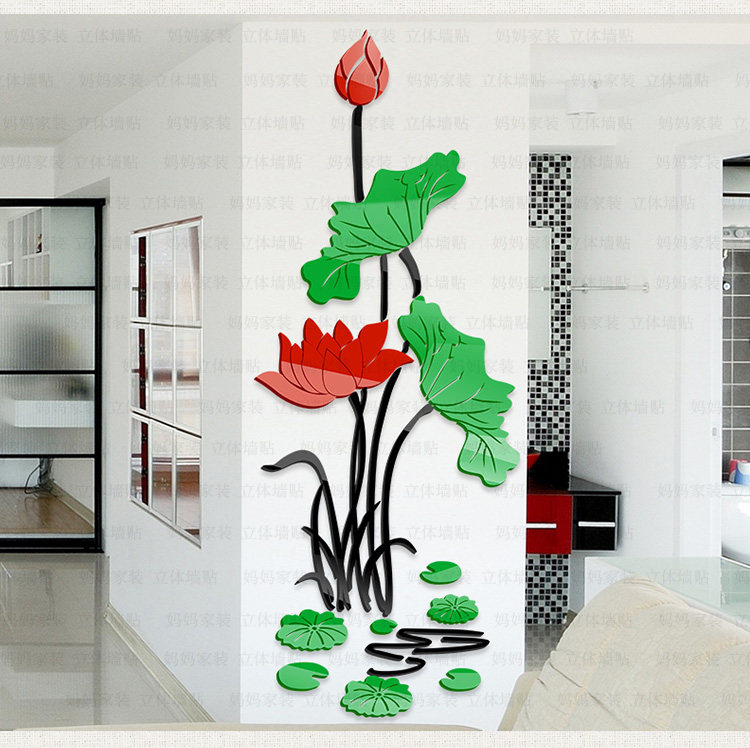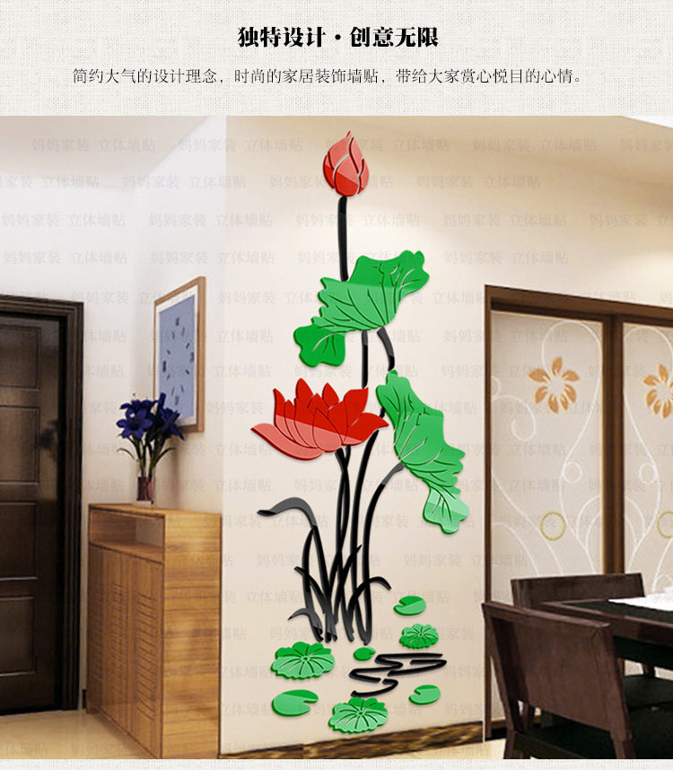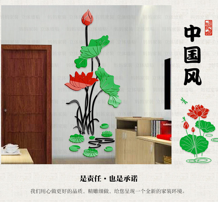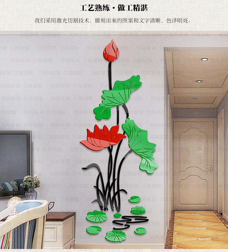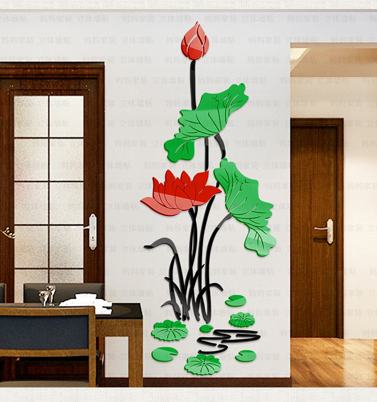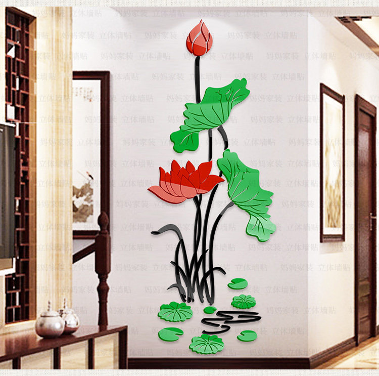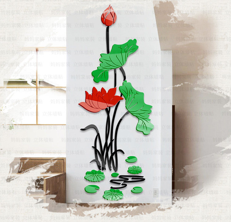 荷花客厅玄关装饰墙贴中国风墙贴画沙发电视背景3d亚克力立体墙贴