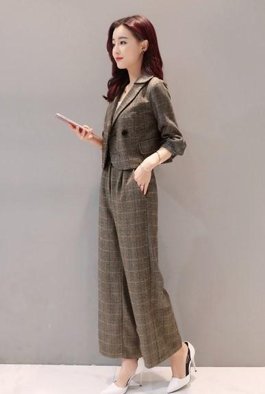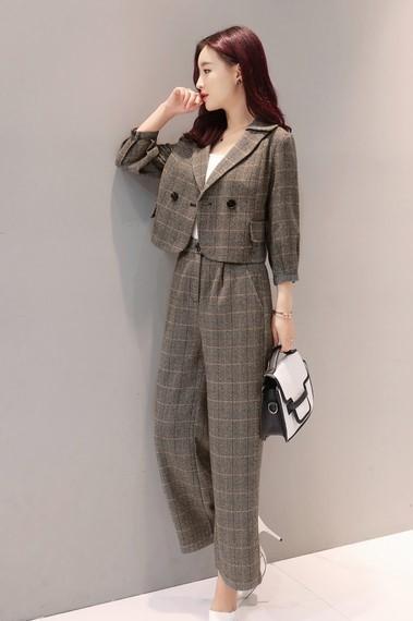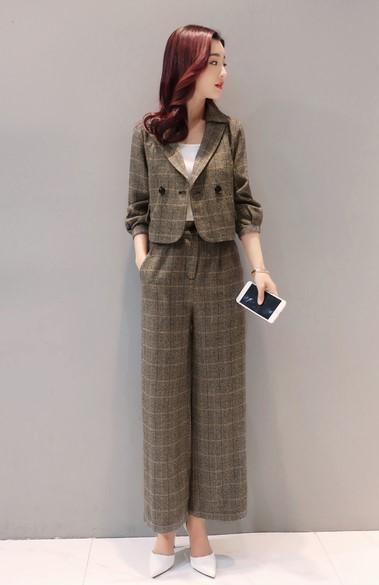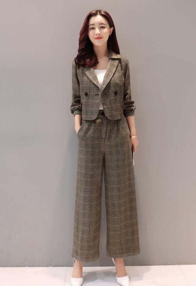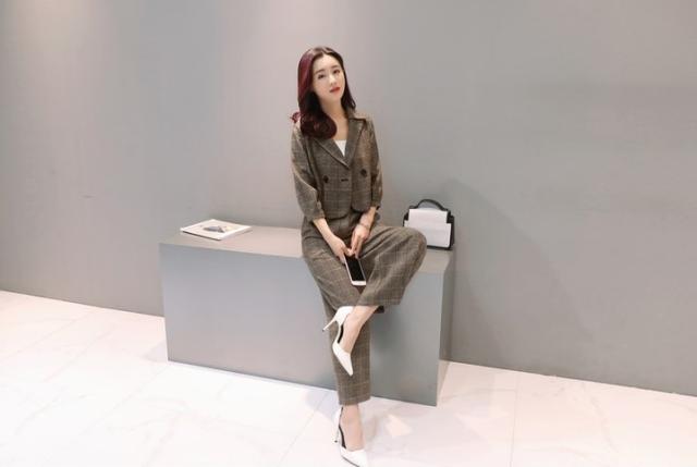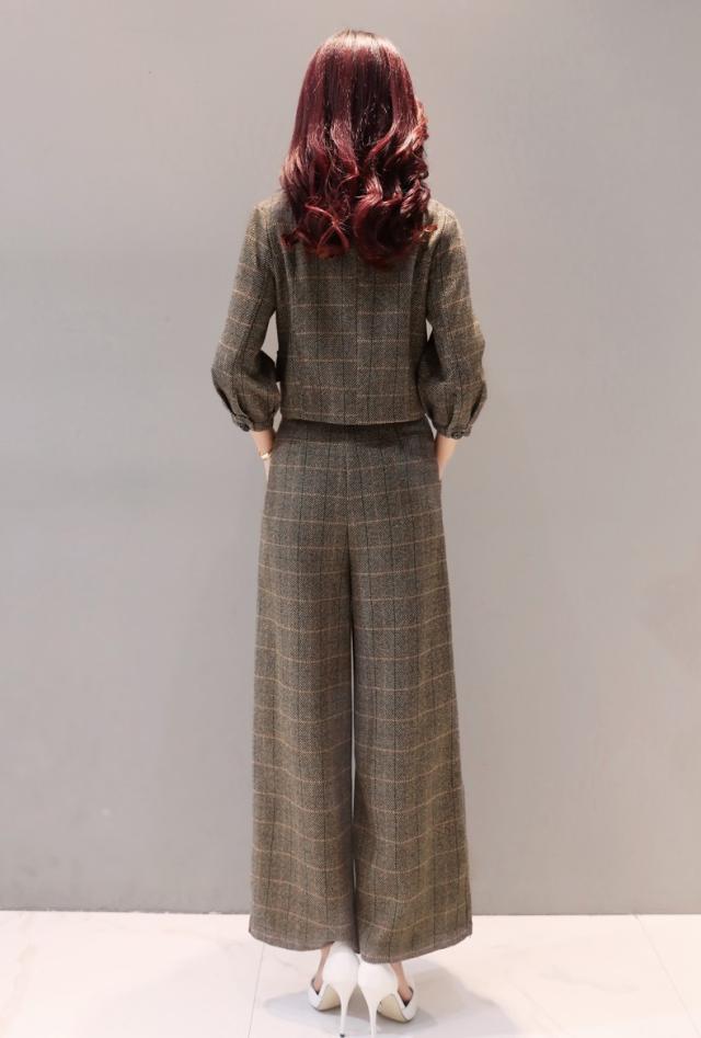 セットアップ ジャケット パンツ 七分袖ジャケット パフスリーブ フロントボタン ワイドパンツ グレンチェック トレンド クール シンプル トラッド フォーマル オフィス デート 女子会 ショッピング モード 海外 ノーブランド