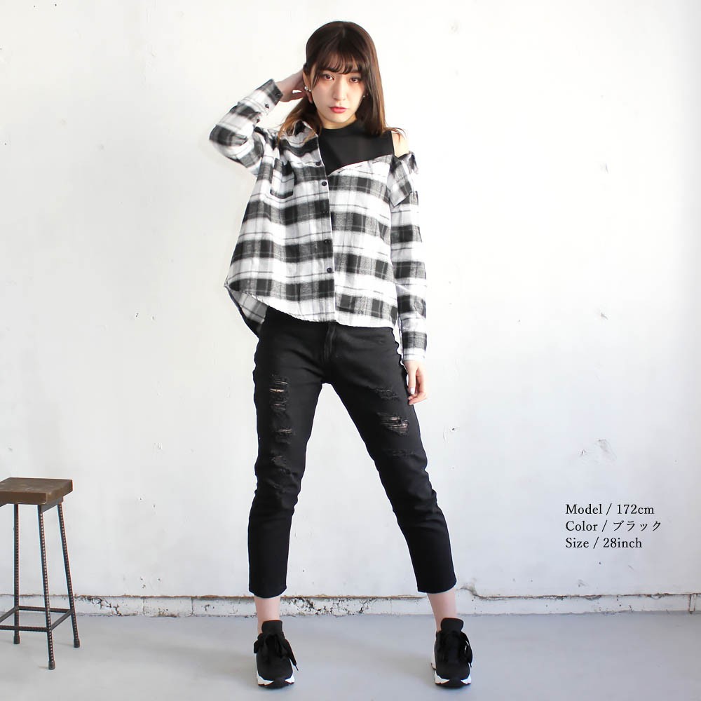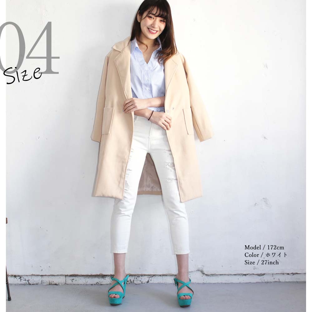 コメント:ロールアップせずに穿いたらくるぶしまでのロング丈です。程よくダメージ加工が施されており、子供っぽくなくラフで大人女性のカジュアル感があります。ストンと落ちるストレートシルエット、足を細く見せてくれるスキニーパンツながらもゆとりがあって動きやすいです。裾をロールアップしてハイウエストで穿くと足首が見えて、着やせ効果もありすっきり見えてスタイルアップにもなります。