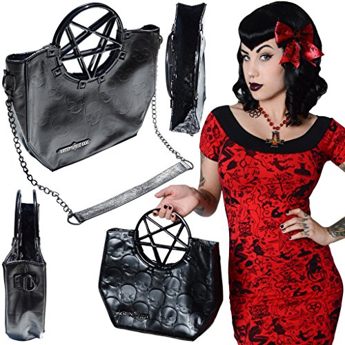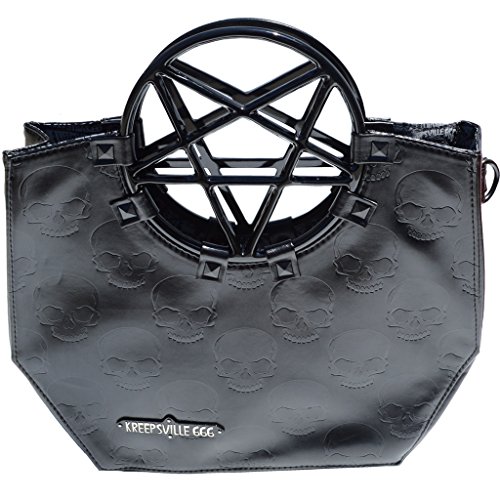 -. Feature : Kreepsville Black Vinyl Skull Embossed Purse With Kreepsville 666 Insignia Badge / Acrylic Handle Featuring Inverted Pentagram / Popper Fastener and Inside Zip Pocket / Detachable Chain Shoulder Strap / Officially Licensed Product