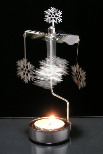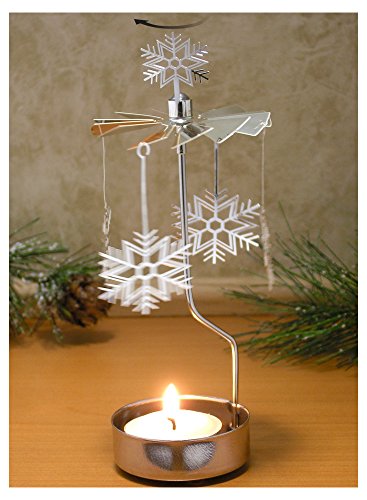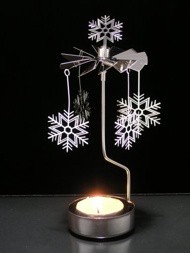 Studio : Banberry Designs Publisher : Banberry Designs Binding : Kitchen Product Description Spinning Snowflake Candle Holder. Fascinatingly beautiful, watch as heat from the candle causes lovely, dancing shadows across the ceiling. Featuring intricately laser cut snowflake designs in silver plate. Dazzling unique candle holders for any home. Measures 6.5" x 3". 0