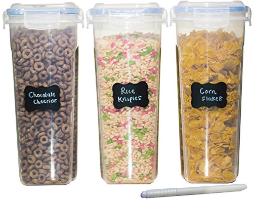 - COMPLETE SET - Your Cereal Container Set comes with 3 Premium BPA Free Food Storage Canisters + 8 BONUS Reusable Chalkboard Labels + 1 BONUS erasable Liquid Chalk Marker allowing you to organize your pantry and enjoy the freshness of your food longer. This set comes complete with reusable labels and marker. No need to buy anything else for marking. Write, peel, stick and enjoy the freshness of your product. We bring you the best VALUE with this complete set.