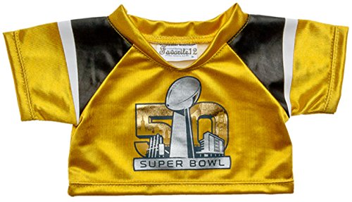 -. Binding : Toy -. Brand : Build A Bear -. Feature : Build a Bear Super Bowl 50 Gold Football Jersey Teddy Size Shirt / Celebrate the big game with this Commemorative Super Bowl 50 Jersey for your favorite furry friend / This NFL gold jersey has Super Bowl 50 graphic on the front / Officially licensed by the National Football League / (teddy bear not included) Ages 3+ -. IsAdultProduct : 0 -. Label : Build-a-Bear -. Manufacturer : Build-a-Bear -. PackageQuantity : 1 -. ProductGroup : Toy -. ProductTypeName : TOYS_AND_GAMES -. Publisher : Build-a-Bear -. Studio : Build-a-Bear -. Title : Build a Bear Workshop Super Bowl 50 Jersey