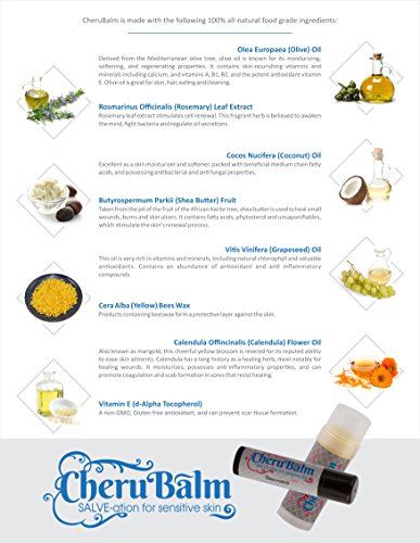 CheruBalm is a premium quality, all natural, and convenient skin balm that's not only perfect for your baby, but can be used on anyone's skin, anywhere. Our 100% all natural formula is enriched with shea butter, olive oil, calendula oil, beeswax, and vitamin E, and is completely free of synthetic chemicals and petrochemicals. Each balm is supplied in a convenient twist tube for easy and clean application. Our unscented, fragrance free option is perfect for those who want all of the skin nourishing benefits with none of the aromatic essential oils. Feel free to try on lips, hands, and dry heels! Take with you summer and winter for use as sun relief or ski balm. The 0.5 ounce twist tube is perfect for throwing in your diaper bag on the go, while the larger 2.0 oz tube is at home alongside your changing table.Feature