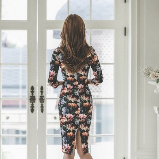 パーティードレス ひざ丈 ワンピース タイト 花柄プリント 七分袖 レトロ Vネック バックスリット 大人 上品 デート お呼ばれ drgz2218