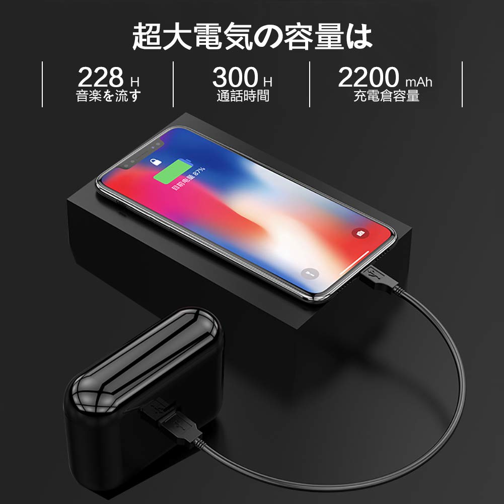 【 大容量充電収納一体式】:携帯電話の聚急充電としても使え、アウトドアの運動に最適です。 1.2時間ぐらいでフル充電後、約4-6時間の連続音楽再生可能しかし2200mAh大容量充電収納一体式ケース付きだたらイヤホン本体は約228時間以上の超長時間連続音楽再生可能です。