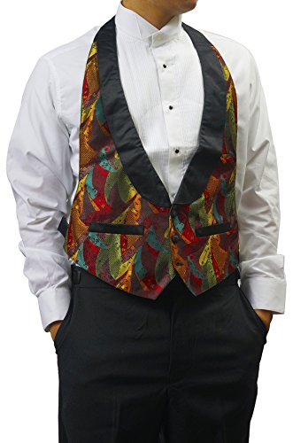 -. Binding : Apparel -. Brand : Broadway Tuxmakers -. Color : black reverses to multicolor -. Department : mens -. Feature : Reversible solid black to multicolor / covered buttons-2 pockets / multicolors-gold, burgundy, green-satin lapel / adjustable on side, full black back on both sides / 100% polyester-dry clean only -. Model : rv-34 -. PackageQuantity : 1 -. ProductGroup : Apparel -. ProductTypeName : SUIT -. Title : Mens Reversible Black Solid or Multi Colored Tuxedo Vest