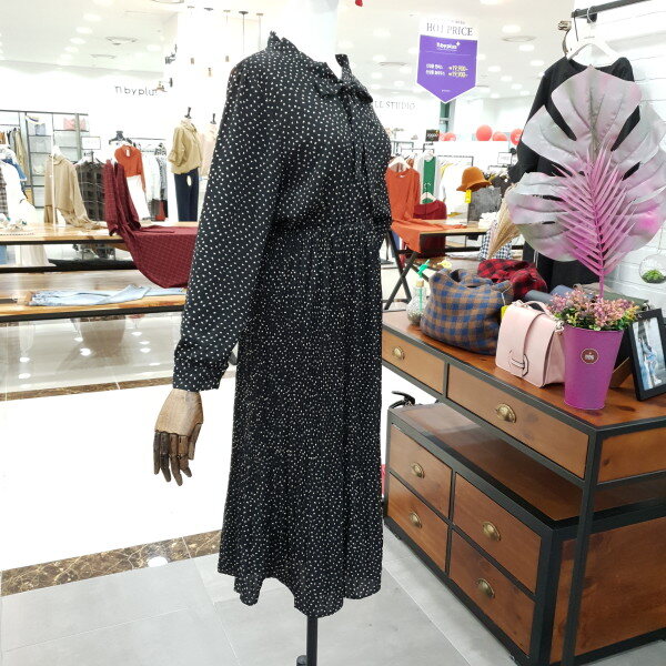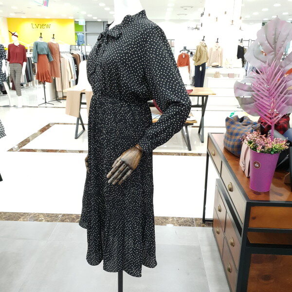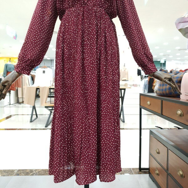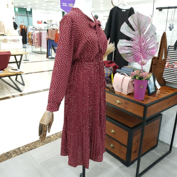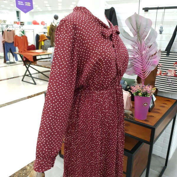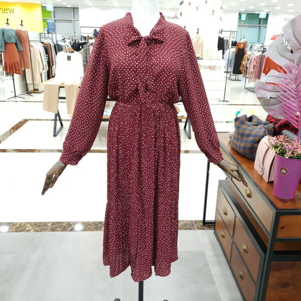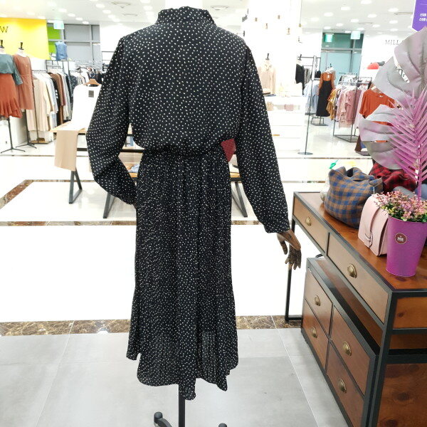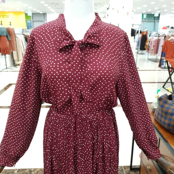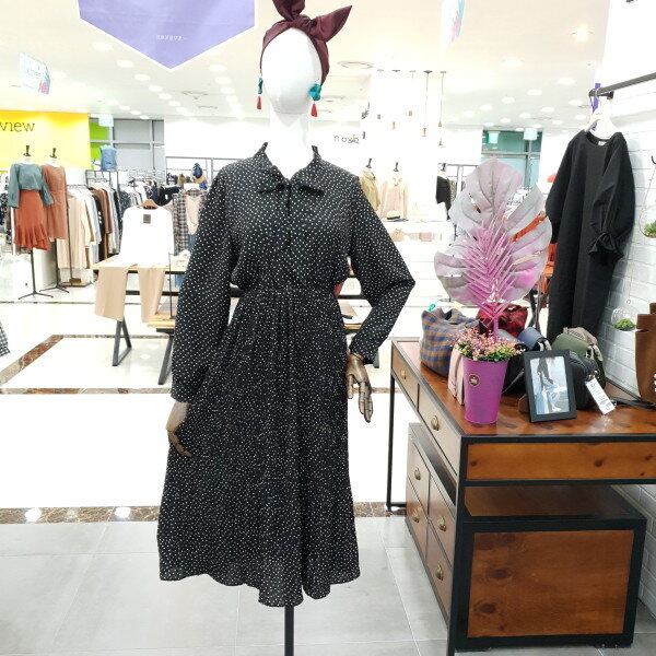 도트주름 쉬폰 원피스 예요.도트의 발랄함과 주름의 날씬함과 네크라인의 리본이 여성스러운 느낌을 물씬 풍기는 예쁜 원피스예요.허리밴딩이 허리라인 위쪽에 있어 하체도 길어보이고 키도 커보이는 효과까지 있는 원피스예요.데일리룩으로도 좋은 아이템 입니다.