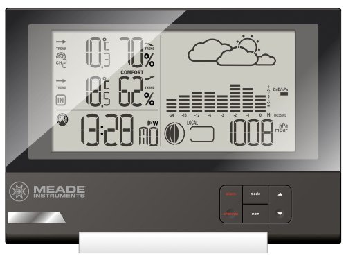 Meade TE636W Slim Line Personal Weather Station with Atomic Clock. Ultra Slim Design. Wireless Indoor/Outdoor Temperature and Humidity. Minimum/maximum memory for indoor/outdoor temperature and humidity. Monitors temperature from up to 3 remotes. 12-Hour to 24-hour weather forecast (with icons). 24-Hour barometric pressure history chart. Comfort level indicators. Automatically sets time to the U.S. Atomic clock. 12-Hour or 24-hour time format with calendar. Crescendo alarm with snooze. One remote sensor (TS21C) included. Wall mount or desktop option. Packaged in window box.