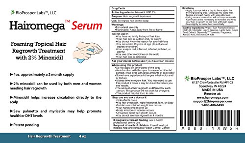 Feature : HairomegaTM Serum is a proprietary 2% Minoxidil foaming solution combined with a blend of herbal DHT blockers. / There is no other product like it on the market. It features minoxidil, the active ingredient in Rogaine® along with ingredients that block DHT directly on the scalp. / HairomegaTM Serum takes a 1-2 punch approach to hair loss: 1- it blocks DHT using its unique blend of herbal ingredients. 2- minoxidil boosts the circulation to the scalp, helping to nourish hair roots and follicles. / Each bottle contains 4 fluid ounces, a 2 month supply. / Made in the USA. Results guaranteed or your money back!