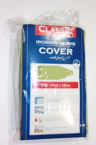 -. Binding : Kitchen -. Brand : J&J home fashion -. Color : Green -. EAN : 6952143801089 -. Feature : 13-15" x 53-54" Standard-size ironing board / Ultrafit skit and seam prevent cover from shifting / Stetch & fit binding for a snug fit / Surelock straps keep cover in place / 10 year warranty -. IsAutographed : 0 -. Label : J&J home fashion -. Manufacturer : J&J home fashion -. MPN : 14223549 -. PackageQuantity : 1 -. PartNumber : 14223549 -. ProductGroup : Home -. ProductTypeName : HOME -. Publisher : J&J home fashion -. Size : 13"-15" wide and 53"-54" long -. Studio : J&J home fashion -. Title : Classic Heavy Use Ironing Board Cover with Pad-Simplicity