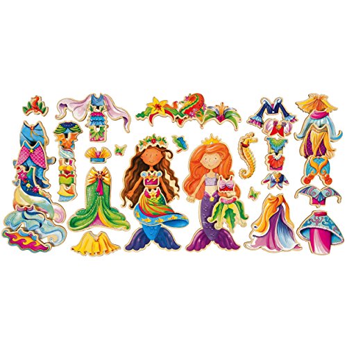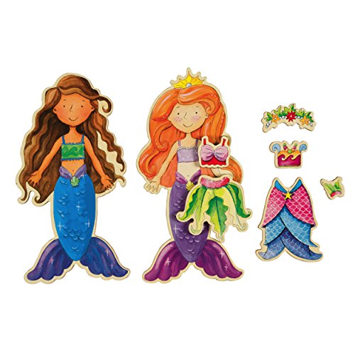 - Feature : Mix and match 40 magnetic wooden clothing pieces to create a variety of colorful fun outfits / Each magnetic wooden doll and clothing piece is beautifully illustrated with detailed watercolor artwork / Set comes in a convenient carrying case with aqua feather trim / Ages 3 and up