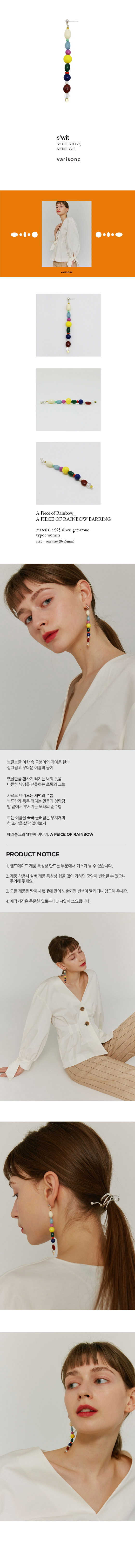 | A PIECE OF RAINBOW EARRING 알록달록 기분좋은 천연 원석을 엮어 무지개의 한조각을 담아낸 스테이트먼트 이어링입니다. [A/S 안내] - 14일 이내의 끊어짐 등 제품 불량에 대해서는 varisonc가 왕복 택배비를 부담하여 교환해드립니다. - 14일 이후의 끊어짐에 대해서는 고객님께서 왕복 택배비(6천원)을 부담하시면 1:1로 무상 맞교환해드립니다. - 구매일 이후 3개월 동안 제품 하자의 경우 무상 A/S 해드리며 추가의 재료가 필요한 경우에는 수선비가 발생할 수 있습니다. - 단, 소재 특성 상 제품 하자가 아닌 고객 부주의로 인한 경우에는 A/S가 어려울 수 있으니 양해 부탁드립니다. - 수선 제품 왕복배송비는 고객 부담입니다. [교환 및 배송 안내] - 제작기간은 주문일로부터 3~4일이 소요됩니다. (영업일 기준) - 베리송크의 모든 제품은 주문제작상품으로 교환 및 환불이 어려우니 신중한 구매 부탁드립니다. - 제품 하자 시에는 동일한 제품으로 교환 가능하며, 받으신 포장상태 그대로 반송 부탁드립니다. |