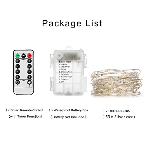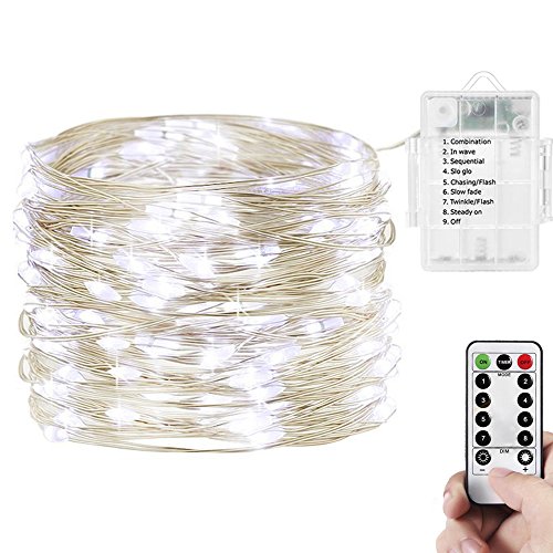 String Lights, ANGOO 1 Set Battery Operated Remote Control Christmas Lights Waterproof 100 LED White String Light 8 Modes 33ft Silver Wire Rope Fairy Lights For Party, Wedding, Festival Decor