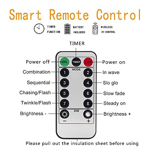 - REMOTE CONTROL: The led string lights with timing function, brightness adjustable, 8 light modes (steady/blinking/ flash/smooth/strobe, etc) create vibrant, dynamic atmospheres. #8 on the remote is the steady on light mode