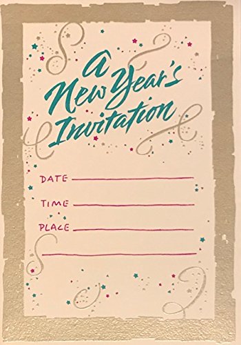 - Features "A New Year's Invitation" printed with in teal font with silver confetti and swirls in the background