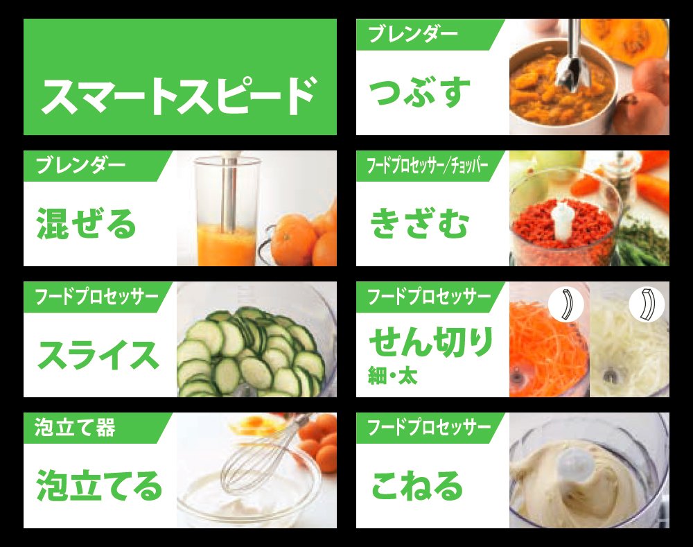 With one touch exchange of attachment, wide usage of "crush" "mixing" "whisk" "quill" "slice" "shredded" "knead" possible