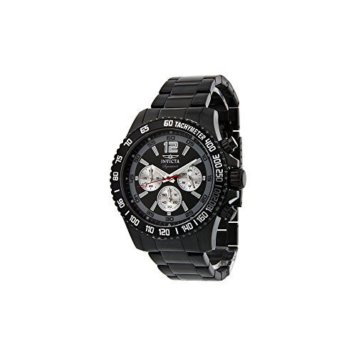 Black PVD stainless steel case and bracelet. Fixed black ion-plated bezel with tachymeter.. Black dial with silver-tone hands and index hour markers. Arabic numeral marks the 12 o'clock position. Minute markers around the outer rim. Dial Type: Analog. Luminescent hands and markers. Chronograph - three sub-dials displaying: 60 second, 60 minute and 24 hour. Quartz movement. Scratch resistant mineral crystal. Screw down crown. Solid case back. Case diameter: 46 mm. Case thickness: 14 mm. Round case shape. Band width: 20 mm. Deployment clasp. Water resistant at 50 meters / 165 feet. Functions: chronograph, hour, minute, second, tachymeter. Casual watch style. Invicta Signature II Divers Chronograph Black Ion-plated Stainless Steel Mens Watch 7413.