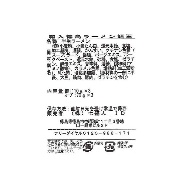 원재료:(면)소맥분,밀 단백,환원 수 엿,식염,가공 전분,주정,물어 들이마시고, 치자나무 색소(《스》-《푸》)라드,간장,포크 엑기스,포크 Paste,환원 수 엿,설탕,식염,젤라틴,효모 엑기스,향신료,주정,조미료(아미노산등)고, 카라멜 색소,증점제(가공 전분)고, 유화 제,증점다당류,(원재료의 일부에 밀,대두,닭고기,돼지고기,젤라틴을 포함한다)