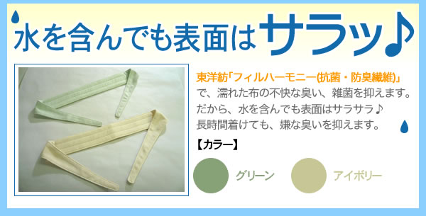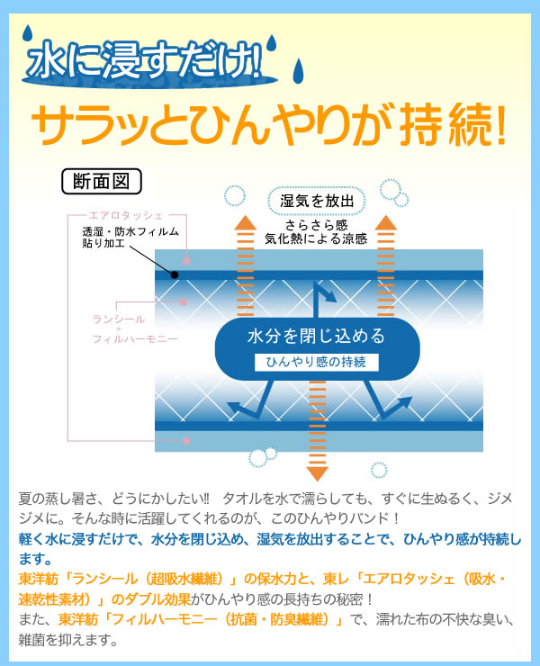 | 水に浸すだけで、水分を閉じ込め、ひんやり感が持続!また、東洋紡「フィルハーモニー」で、濡れた布の不快な臭い、雑菌を抑えます。レジャー、スポーツ観戦、炎天下の作業に最適です! |