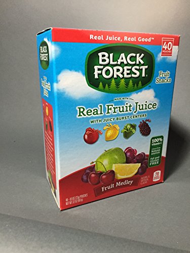 -. Binding : Misc. -. Brand : Black Forest -. EAN : 0041420471490 -. Feature : 100% Vitamin C / Colors from Natural Sources / Fat and Gluten Free / Assorted Flavors like Cherry, Lemon, Grape and Apple / Your Kids Will Love These and You will Love Yourself for Giving them a snack that is both enjoyable and nutritious. -. Label : Ferrara Candy Company -. LegalDisclaimer : Except as expressly set forth in the item description, seller makes NO EXPRESS OR IMPLIED warranties of any kind whatsoever about this merchandise.Seller is not responsible for consequential, incidental or punitive damages of any kind whatsoever. Seller's liability is limited to the amount paid by Buyer including shipping/handling charges. -. Manufacturer : Ferrara Candy Company -. NumberOfItems : 40 -. PackageQuantity : 40 -. ProductGroup : Grocery -. ProductTypeName : GROCERY -. Publisher : Ferrara Candy Company -. Studio : Ferrara Candy Company -. Title : Black Forest Fruit Medley Fruit Snacks - 40 - 0.8 Oz Pouches -. UPC : 041420471490