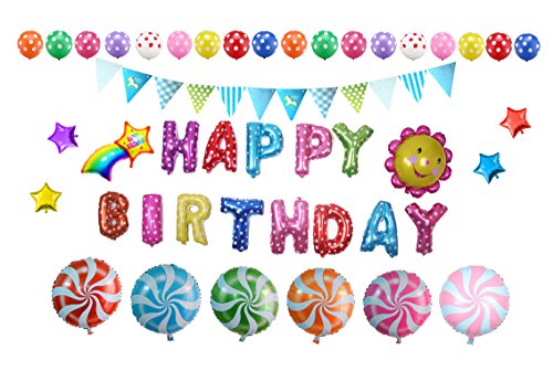 - 1. One Birthday Balloon Set for Decoration: Includes 13 pieces of HAPPY BIRTHDAY alphabet balloons; 6 round candy lollipop balloons; 1 sunflower balloon; 1 balloon in rainbow with star shape; 20 Polka Dot balloons; 4 star balloons; 1 triangular flag banner; 200 pieces of balloon stickers.