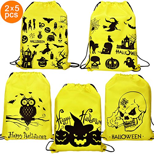 -. Feature : Halloween Festive Designs: Halloween goody bags were designed by Halloween-themed symbols that including toothy jack-o-lanterns, owl, cool skull, silly ghosts, spooky spiders, witches, bats and much more. Halloween treat bags set includes 10 bags per set with 5 designs. / Great Gift: Trick or treat bags for kids boys and girls, ideal gifts for Halloween party favors bags, candy bags, goody bags, toys bags, Halloween treat bags, Halloween promotion activities and more. / Light Weight & Durable: Halloween drawstring treat bags are lightweight and easy to carry, made of 100% nylon fabric, the fabric is good quality and durable. / Good Size & Reusable: Halloween candy bags measures 16. 5"x13", it is big enough to carry lots of candy, chocolates, toys, sweet treats and other goodies; Reusable drawstring bag - a great replacement for plastic and paper bags ! / What You Get: 10 pcs Halloween drawstring backpack bags, 24-month warranty & our friendly customer service.