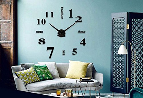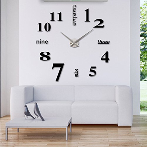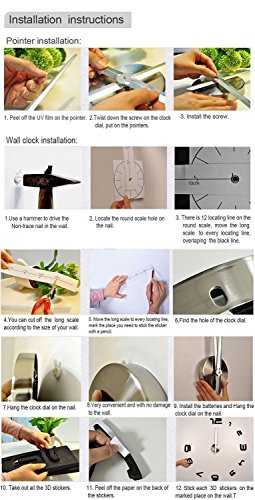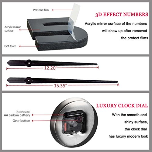 -. Feature : Minute hand 15.3in/39cm,hour hand 12.2in/31cm,clcok dial 4.7in/12cm,Package size:16.5*5.5*1.9 in/42*14*5cm,weight:14oz/400g.Package included: 1 x DIY wall clock Kit,invisible nail(to hang the clock dial without leaving trace on the wall),very detailed colorful English manual,auxiliary paper scale(to help you put the numbers in the right spots).Note:Battery is not included; / EASY TO INSTALL:We assure you of MOST detalied colorful English manual included,step by step,also super friendly customer service will teach you until you know how to install; / This wall clock is REMOVABLE and the size is ADJUSTABLE.You can put the numbers everywhere as you like,you can also decide the distance from the numbers to the clock center. The clock finishing size depends on your preference to decorate your wall,the minimum achieving is: 63cm x 63cm / 24.8" x 24.8".The diameter of the clock can be adjusted from 63~120 cm/24.8~47 in,but the best effect is about 100cm/39in; / Material: Alloy clock dial,aluminum clock pointer and self-adhesive EVA foam stickers with acrylic mirror surface; / A classic,modern and luxirious home decoration!You can put it in living room,bedroom,office,kitchen,anywhere with a wall, except bumpy wall,the metope of drop ash,uneven wallpaper;