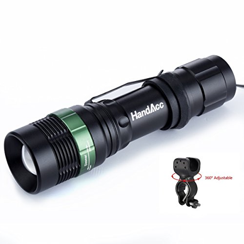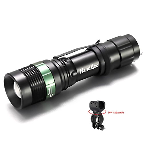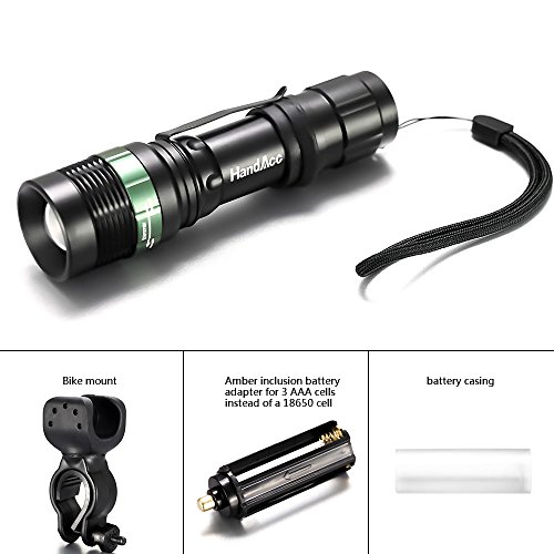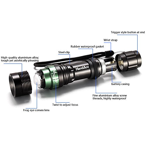 Studio : HandAcc Publisher : HandAcc Binding : Home Product Description HandAcc to Your Hand HandAcc Flashlight Torch - Brightness in your Hand Why choose HandAcc Flashlight Torch? 1. Three Accessories for Increased Convenience - Bike mount: Just fix the bike mount onto your bike. - Head strap: To use as a headlamp, just wear the head strap on your head. - Hand strap: Make the torch more portable easier to carry. 2. Scientific Design - Adjustable focus for use in different situations (just rotate torch head to adjust zoom). - Three levels of brightness. - Solidly constructed: Skid-proof, waterproof, explosion-proof, and shockproof. Notes: 1. Do not look directly into the flashlight. 2. Do not tamper with the torch head or separate the reflector from the light bulb. 3. Avoid exposure to direct sunlight. What's Included: 1 x HandAcc Flashlight Torch 1 x Bike mount 1 x Hand strap