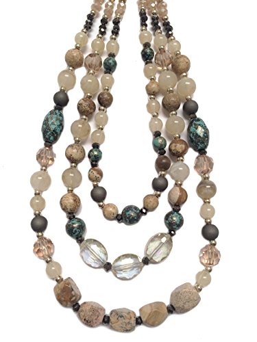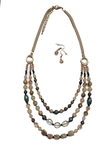 Triple strand mixed neutral color palette is perfect compliment to any outfit and makes a statement. Necklace measures long 21" inches long including extension chain. This matching Earring and necklace set makes a great gift. Looks very nice worn at the office or out on the weekend.Feature