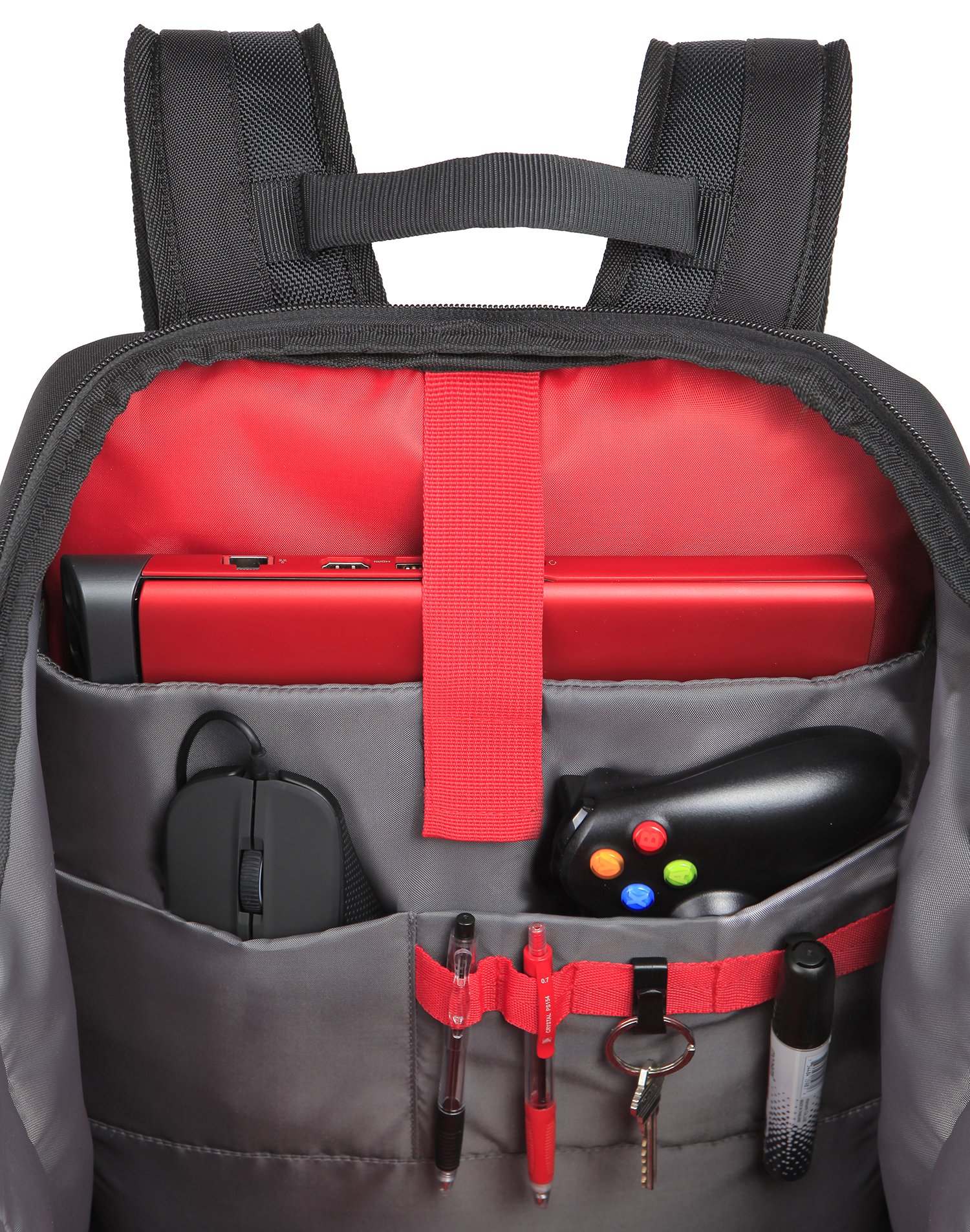 The spacious interior of the fastener opening and closing type has a sleeve dedicated to the notebook computer and several storage pockets, so you can organize and store small items for games and you can bring out what you need easily and without stress.