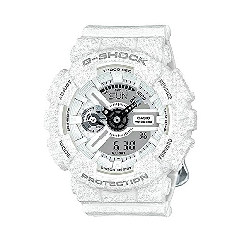 The recent release of the GA-110HT full-size models is the G-Shock GMAS-110HT Heathered S Series for women. While the men's release had a more conservative selection of black, blue, white, and gray, the women's series gets more colorful choices including the GMA-S110HT-4A (orange), GMA-S110HT-6A (purple), GMA-S110HT-7A (white), and GMA-S110HT-9A (yellow). The Heathered Series is known for having a textured look that resembles fabric, and the colors on these models extends to the watch face. These smaller women's models measuring 49 X 45.9 X 15.8 mm make a great "his 'n' hers" combo with the larger modelsFeature
