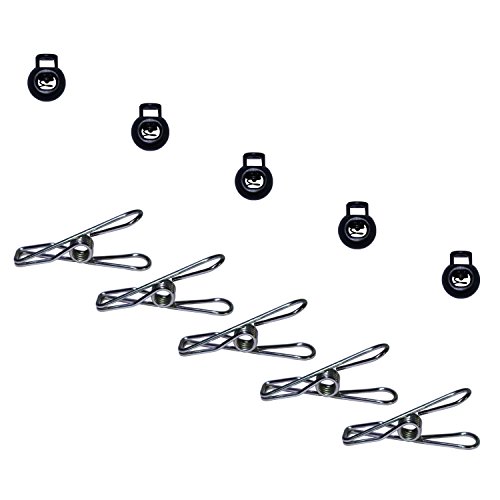 - Clothesline with 13 pcs black positioning buckle that restrain the 12 pieces of clothespins to sliding around, protect the clothes from being blown away. Those that love traveling, camping, swimming, fishing, boat riding etc. can use it between the trees or in their canopy to attach wet towels and trunks.Additional with 5pcs Stainless Steel Spring Utility Clip and 5pcs Single Hole Spring Round Ball Fastener Locks Buttons