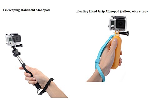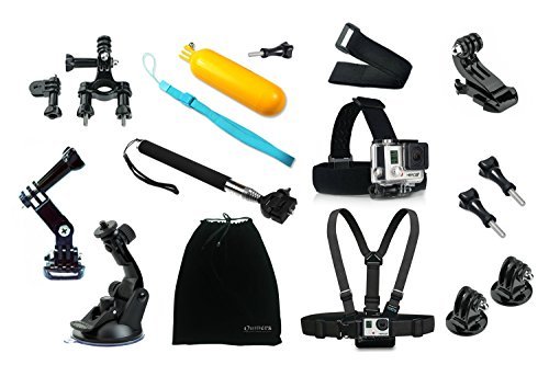 9pcs accessories includes: Carry bag + Telescoping Handheld Monopod + Handlebar Mount Holder + Chest strap + Head Strap + Wrist Strap + Floating Hand Grip Monopod + 3-Way Adjustment Base + Suction Cup