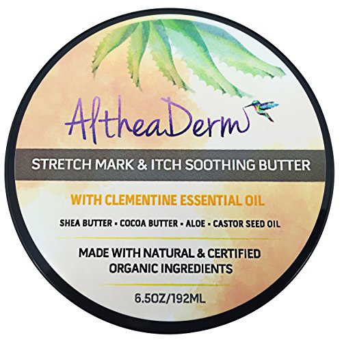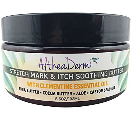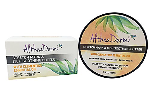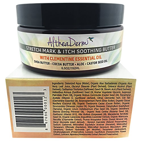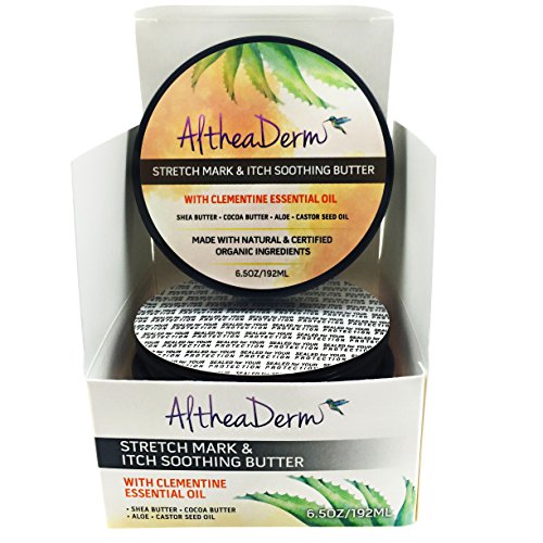 The Best Defense against New stretch marks is early consistent intervention to promote skin elasticity during the stretching of the epidermis. AltheaDerm has proven effective ingredients that penetrate deep within the layers of skin and nourish it back to health ? Loaded with Premium ingredients like Raw Shea Butter, Aloe Vera, Castor Seed Oil, Cocoa Butter, Coconut oil, Sunflower Oil, Safflower Oil, Palm Oil, Jojoba Oil, Rosehip Oil, Sweet Almond Oil, Tamanu Oil, Macadamia Seed Oil, Vitamin E, B12 and other Essential Key Ingredients (CAUTION; This product contains Sweet Almond Oil) ? Visit the AltheaDerm website to read all the ingredients and skin benefits AltheaDerm is perfect for expecting mothers to prevent new unsightly stretch marks and prevent itching ? Moisturize tummy, breasts, hips, etc. to promote skin elasticity ? Alleviates the crazy itching during and after pregnancy. Ultra-hydrating formula soothes dry itchy skin for hours of relief ? NO harmful synthetic fragrances, phthalates, parabens, sulfates, or toxins ? Stretch Mark Cream and Oil all in one Natural healing properties in AltheaDerm assist in diminishing the appearance of existing stretch marks and scars ? Nourish deep within skin layers to soften scar tissue and allow healing ? Non-greasy, absorbs quickly and locks in moisture This AltheaDerm Butter has Clementine Essential Oil added to provide a clean Citrus scent ? Rich in Vitamin C and Folic Acid. Excellent in building collagen and promoting elasticity ? Repairs damaged skin and keeps it soft supple ? 6.5 Oz. of product in a large over-sized butter jar for easy application Buy with confidence. AltheaDerm offers a hassle free 100% money back guarantee Click Add to Cart above to start enjoying AltheaDerm Stretch Mark Itch Soothing Butter 0 |