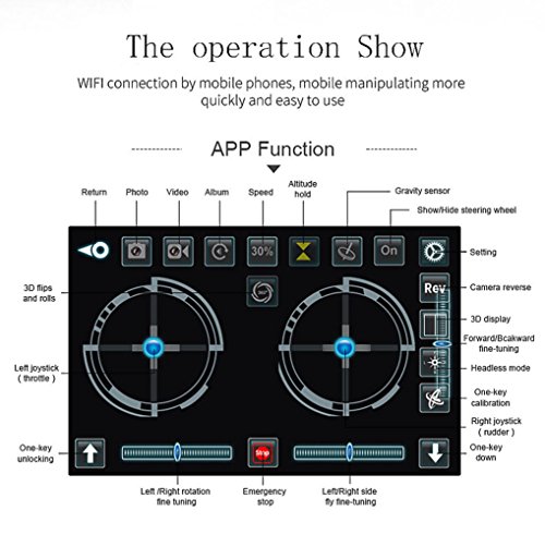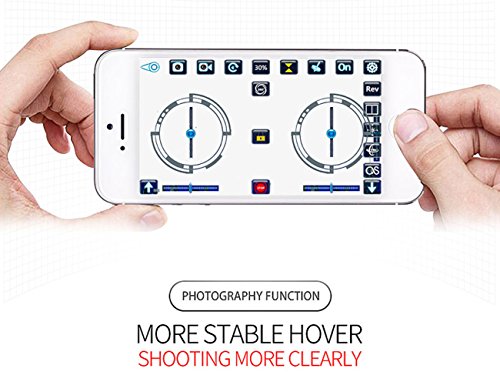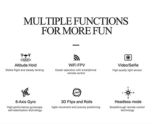 Studio : Jiada Publisher : Jiada Binding : Misc. Product Description Foldabl Drone with Camera Live Video 2.4G 4Axis Gyro Drones Toy Headless Altitude Hold Easy to Fly for Beginner(APP and Remote control included) It has HD camera that the pictures can be more delicate and true; it has video feedback system which can take pictures and videos to record the wonderful moments. Specification: Frequency: 2.4G Gyro: 4 axis Material: ABS Size: 25.5cm * 25.5cm * 3.5cm (Unfolded ) Weight: 14.5kg Flight time: about 6-7 minutes Charging time: About 60 minutes Control distance: 50-70M Battery for quadcopter: 3.7V 600mAh 0