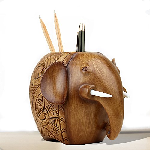 YEHAM Elephant Pencil Holder Organizer Brush Pot Decoration Wood Carving