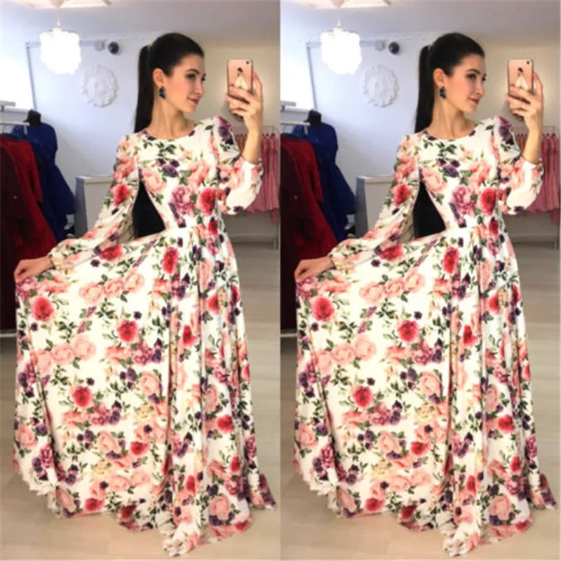2018新しい自由奔放に生きるファッション多色女性ロングドレス花春ロングスリーブシフォンビーチパーティー着用女性マキシドレスvestidos