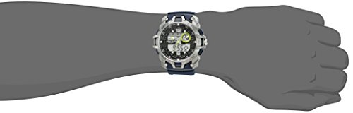Navy blue resin case with silver-tone top ring; analog-digital display with time, seconds, day and date; navy blue resin strap with buckle closure