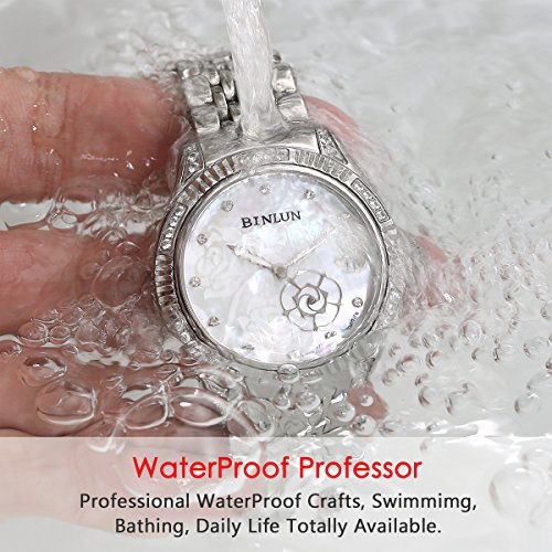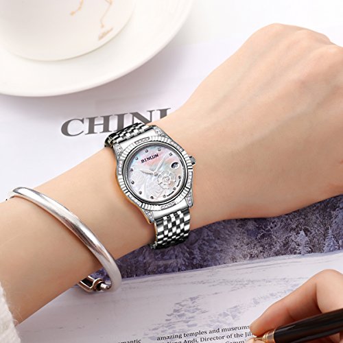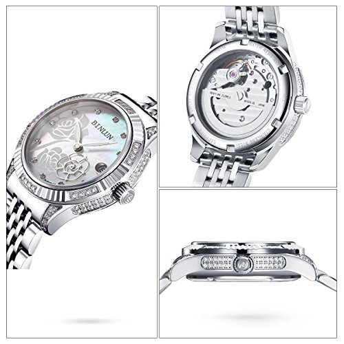 BINLUN Stainless Steel Ladies Automatic Watches Silver Waterproof Women's Watches Rose Hand Date