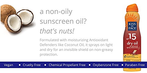 -. Binding : Health and Beauty -. Brand : Kiss My Face -. EAN : 0028367844365 -. Feature : Practice safe sun while getting a sun-kissed glow. This lightweigh, non-greasy sunscreen will keep you moisturized and protected / Formulated with a blend of nourishing ingredients like Vitamin E & C and Coconut Oil. / Also contains Nourishing Antioxident Defenders like Argon Oil and Green Tea. / Provides broad spectrum protection with 80 minutes water resistance. Air-powered spray for any angle coverage with no chemical propellants / Cruelty free and Vegan - formulated with Gluten Free ingredients and no artificial fragrances - also a Phthalate free, Paraben free, and Oxybenzone free. Leaping Bunny Certified -. Label : Kiss My Face Corp -. Manufacturer : Kiss My Face Corp -. Model : 1800613 -. MPN : 0002836784436 -. NumberOfItems : 1 -. PackageQuantity : 1 -. PartNumber : 0002836784436 -. ProductGroup : Beauty -. ProductTypeName : BEAUTY -. Publisher : Kiss My Face Corp -. ReleaseDate : 2017-02-13 -. Studio : Kiss My Face Corp -. Title : Kiss My Face Dry Spray Oil Sunscreen Continuous Spray SPF 15, 6 Oz -. UPC : 028367844365