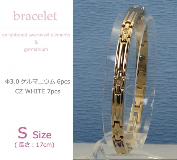 イオンプレーティング(IPメッキ)を施したミラー仕上げの純チタンブレスレットに、スワロフスキーキュービックジルコニアを7pcsと、99.99%の高純度ゲルマニウムを6pcs使用しました。様々なコーディネートに合わせやすいシンプルなデザインです♪ |