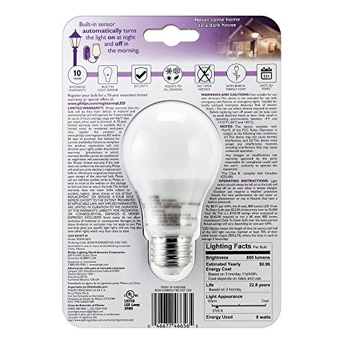 Studio : Philips Publisher : Philips Binding : Tools Home Improvement Product Description Philips Classic Glass A19 Indoor/Outdoor LED light bulbs provide 800 Lumen’s of soft white light, equivalent to 60-watt incandescents with 80% less energy use. These bulbs fit standard medium base (E26) fixtures with the look and feel of a classic bulb. Not for use with Philips HUE products. At 2700-Kelvin, these soft white bulbs offer warm and comfortable lighting with high CRI (color rendering index) to deliver bright, crisp color ideal for whole room ambient light as well as in area lamps. Best-in-class Philips LEDs provide turn on instantly with energy-efficient flicker-free, natural light that won't degrade over time. Unlike cheaper imitations, Philips LED offers clean, natural lighting with exceptional clarity. LED light bulbs last up to 10X longer than incandescent and halogen bulbs. Unlike fluorescent and compact fluorescent bulbs, Philips LEDs are mercury-free so they don't contribute to hazardous waste. This pack of 4, A19 Philips LEDs comes with a 5-year warranty. Each bulb is expected to deliver a lifetime of up to 15,000 hours and over 10 years (based on three hours per day), saving you the cost and hassle of frequent bulb replacement. 0